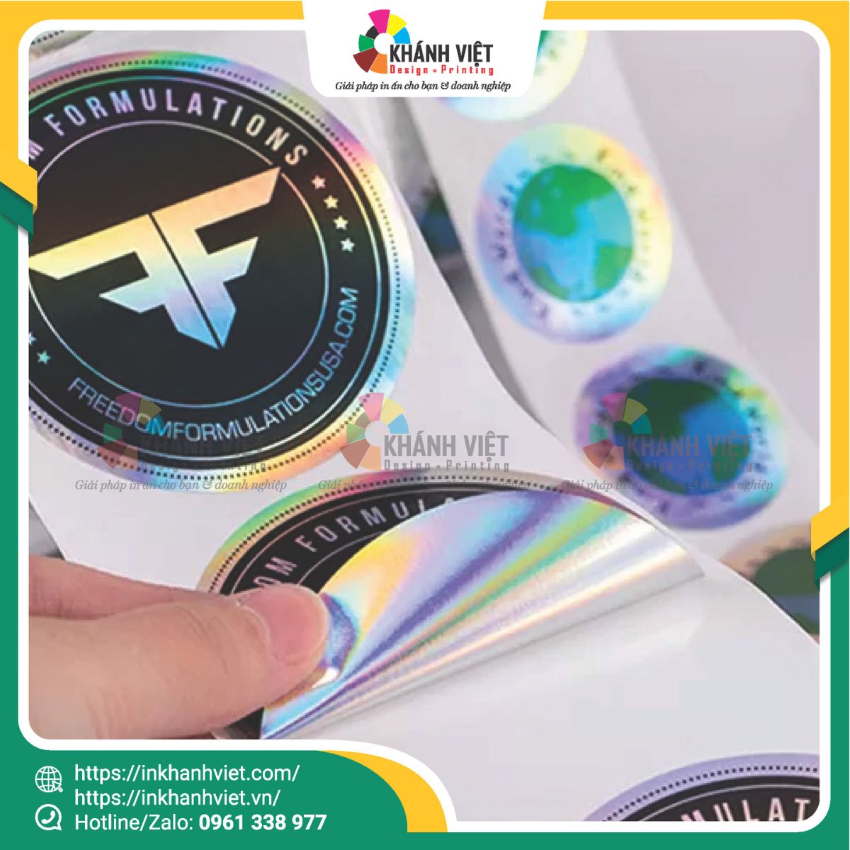 Khác với in màu thông thường, công nghệ in hologram giúp logo phản chiếu hàng loạt sắc màu khi thay đổi góc nhìn, tạo chiều sâu và hiệu ứng thị giác mạnh mẽ. Điều này khiến khách hàng không chỉ “nhìn thấy” mà còn “cảm nhận” được sự chuyên nghiệp của thương hiệu.