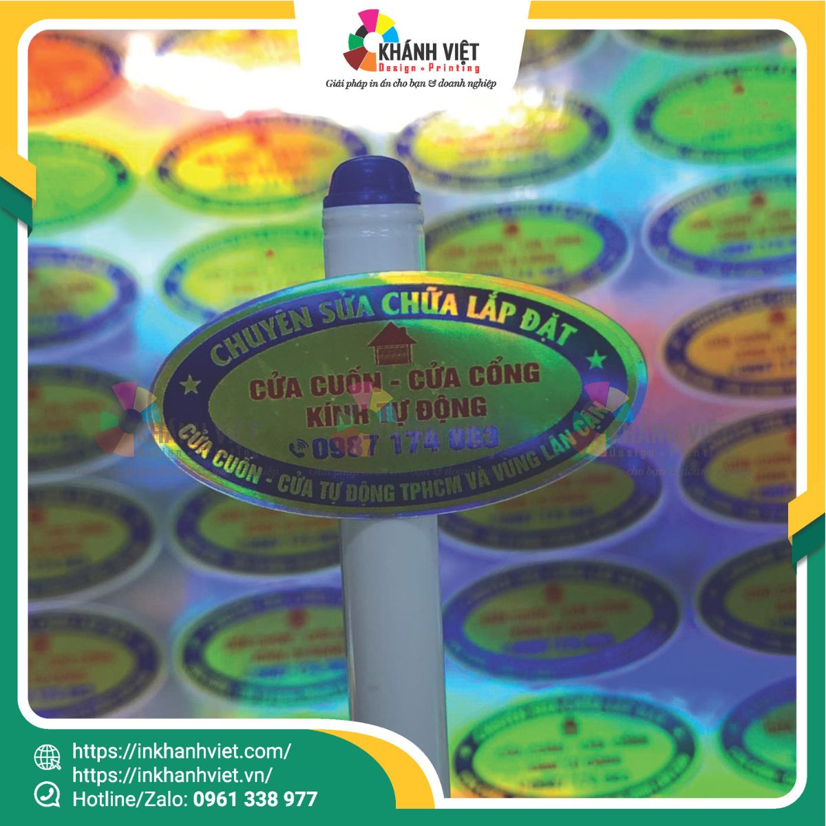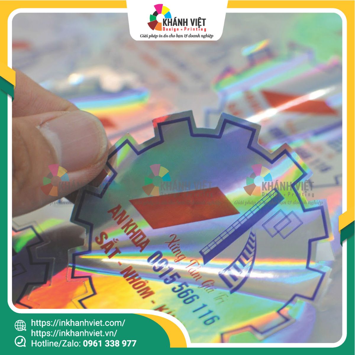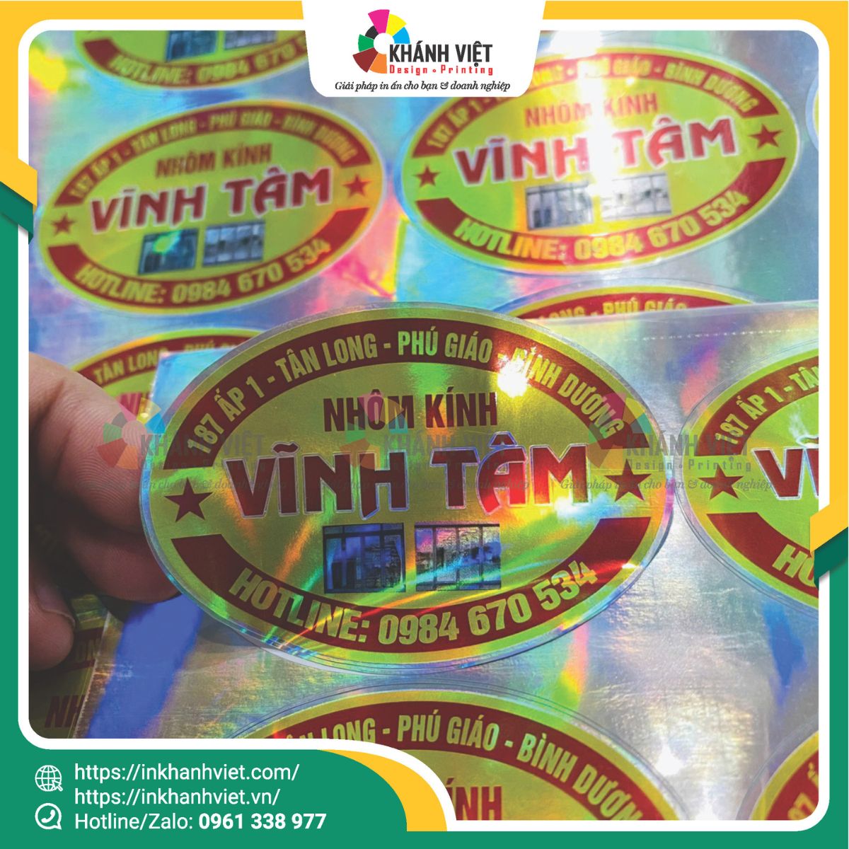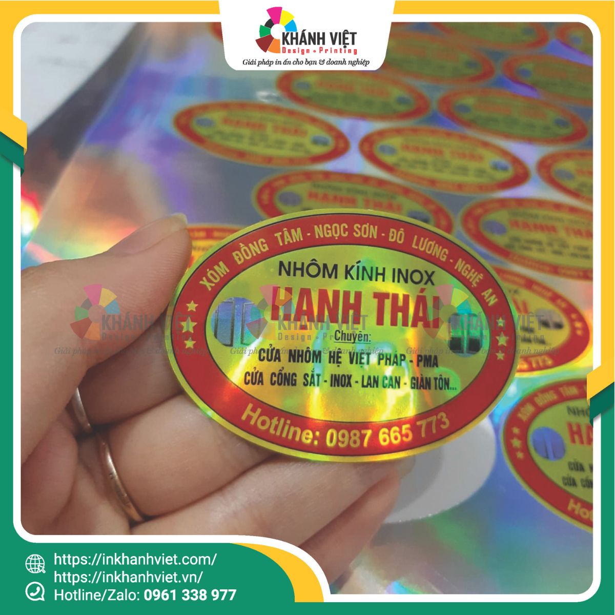 Được in trên decal hologram ánh kim, tem sở hữu hiệu ứng đổi màu rực rỡ khi thay đổi góc nhìn, tạo cảm giác hiện đại và tinh xảo – rất phù hợp với tính thẩm mỹ của ngành nhôm kính.
