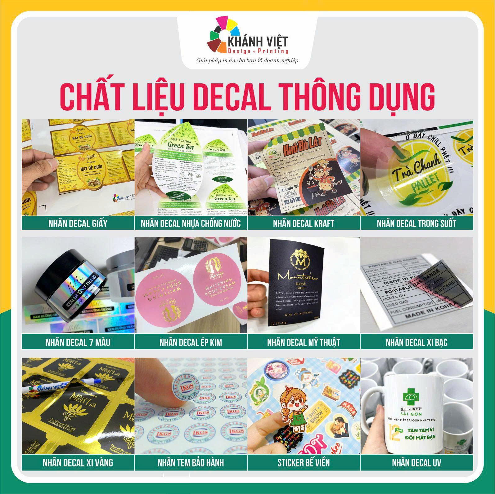 • Decal nhựa (PVC, PP): Bền bỉ, chống nước, xé không rách, chịu được nhiệt độ và hóa chất tốt. Lý tưởng cho sản phẩm có dầu mỡ, ẩm ướt hoặc cần bảo quản lạnh.